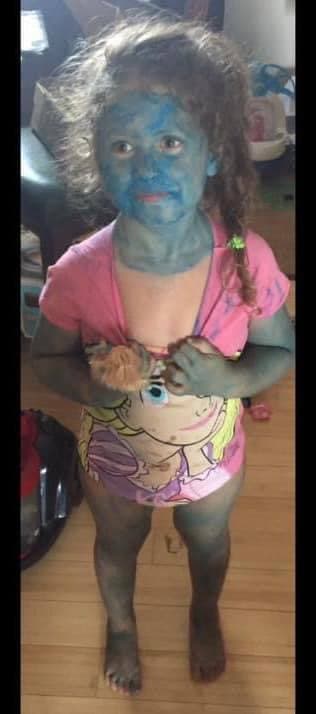 «Elle voulait être une schtroumfette... Elle était tellement contente. C’est le résultat que ça donne quand tu demandes à ses grandes sœurs de la surveiller! »