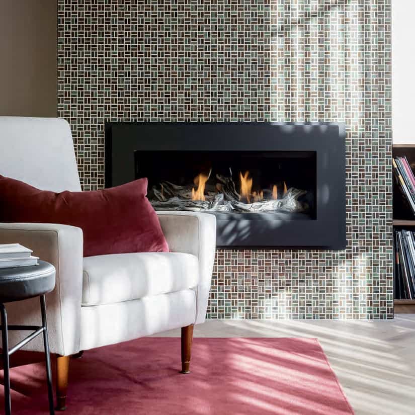 Encastré dans une cheminée habillée de petits carreaux aux formes géométriques, ce foyer à gaz linéaire ne manque pas de caractère! Offerte dans une vaste gamme de motifs, de couleurs et de prix, la céramique demeure fort populaire pour ce type d’utilisation, car elle est solide et résistante à la chaleur. Pour s’assurer du plus bel effet, sans trop de coupes dans le matériau, on choisit un carrelage dont les dimensions s’ajusteront au mieux à celles du manteau de cheminée.