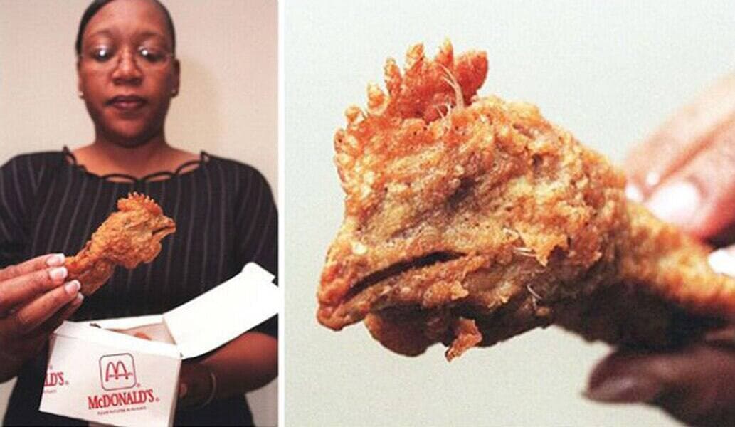 Une femme a trouvé une tête de poulet entière panée dans les croquettes de poulet de son fils chez McDonald's. N’ayant pas aperçu la tête du premier coup, c’est son fils qui lui a crié de ne pas la manger. Elle a obtenu 100 000$ en compensation de la société.