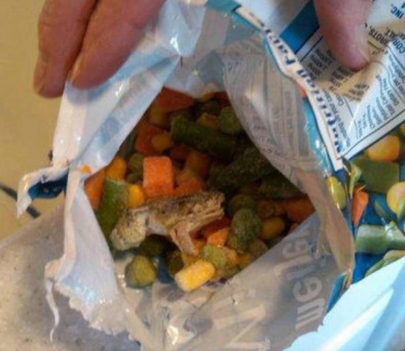 Un homme a trouvé une grenouille dans un sac de légumes congelés. La grenouille était aussi congelée que les légumes et avait la bouche ouverte lors de la trouvaille.