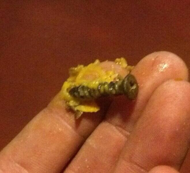 Une femme a trouvé une vis d’un pouce dans du macaroni au fromage. Elle dit avoir mastiqué puis avoir senti quelque chose de dur. C’est à ce point qu’elle a réalisé qu’elle venait d’avaler une vis. Elle est restée à l’hôpital le temps que la vis passe dans son système digestif.