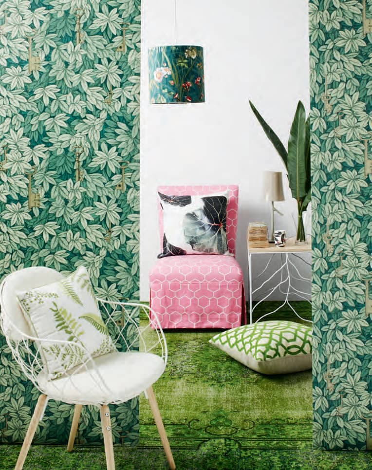 Dans ce boudoir, on s’est permis de faire cohabiter sept imprimés différents où le rappel de couleur et la parenté des motifs – des feuillages – servent de fil conducteur et produisent une unité visuelle. Les motifs en total look et l’accumulation d’imprimés s’inscrivent dans la tendance.