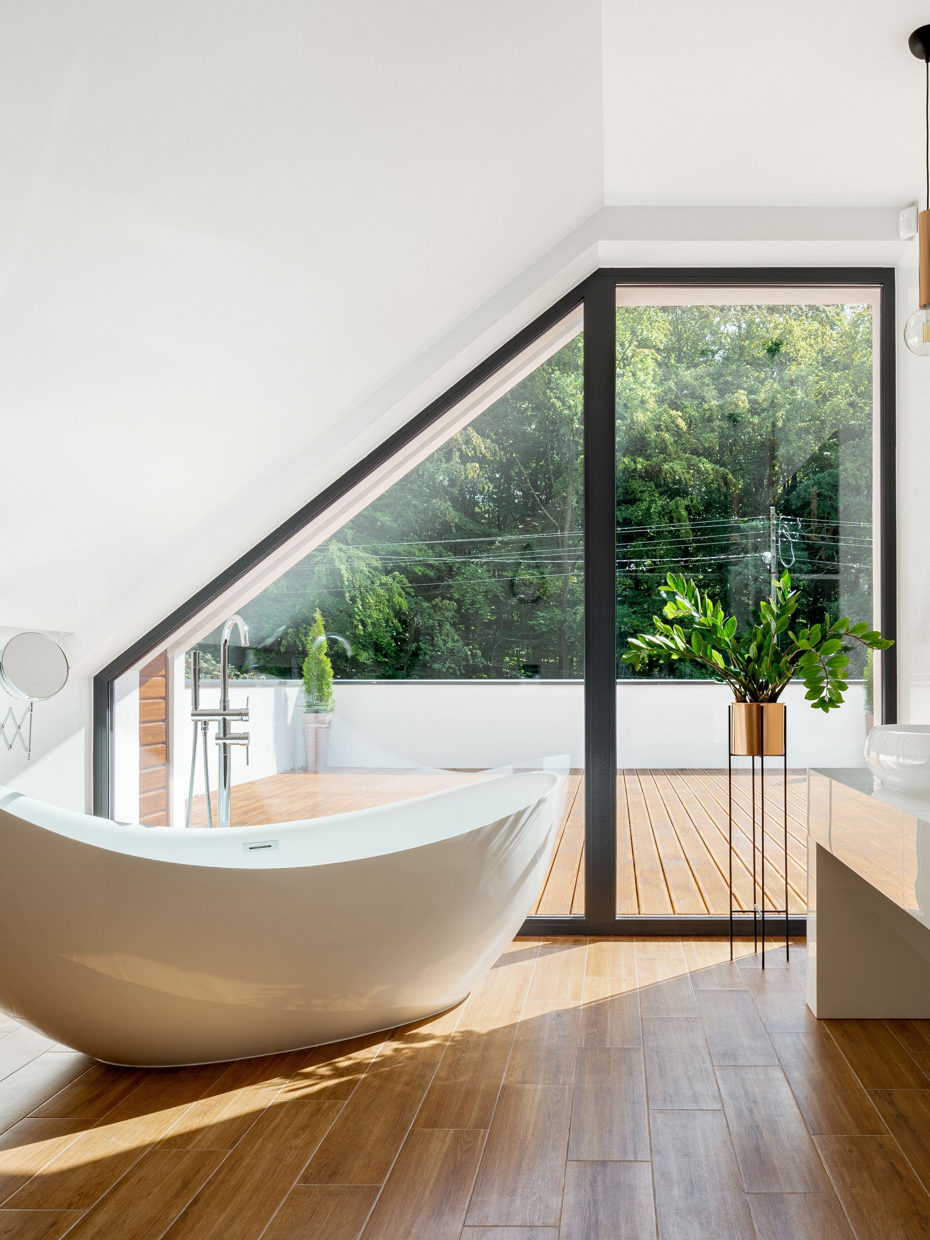 Si vous avez la chance d'avoir une imposante fenestration dans la salle de bain, vous devriez miser sur l'ajout de plantes vertes pour redonner un second souffle au décor. Lorsque viendra le temps de magasiner les options de plantes, il faudra s'assurer que celles-ci tolèrent les écarts de température et soient familières avec l'humidité. Rares sont celles qui n'ont besoin de presque aucune lumière, mais il est toujours possible de trouver de jolies plantes artificielles.