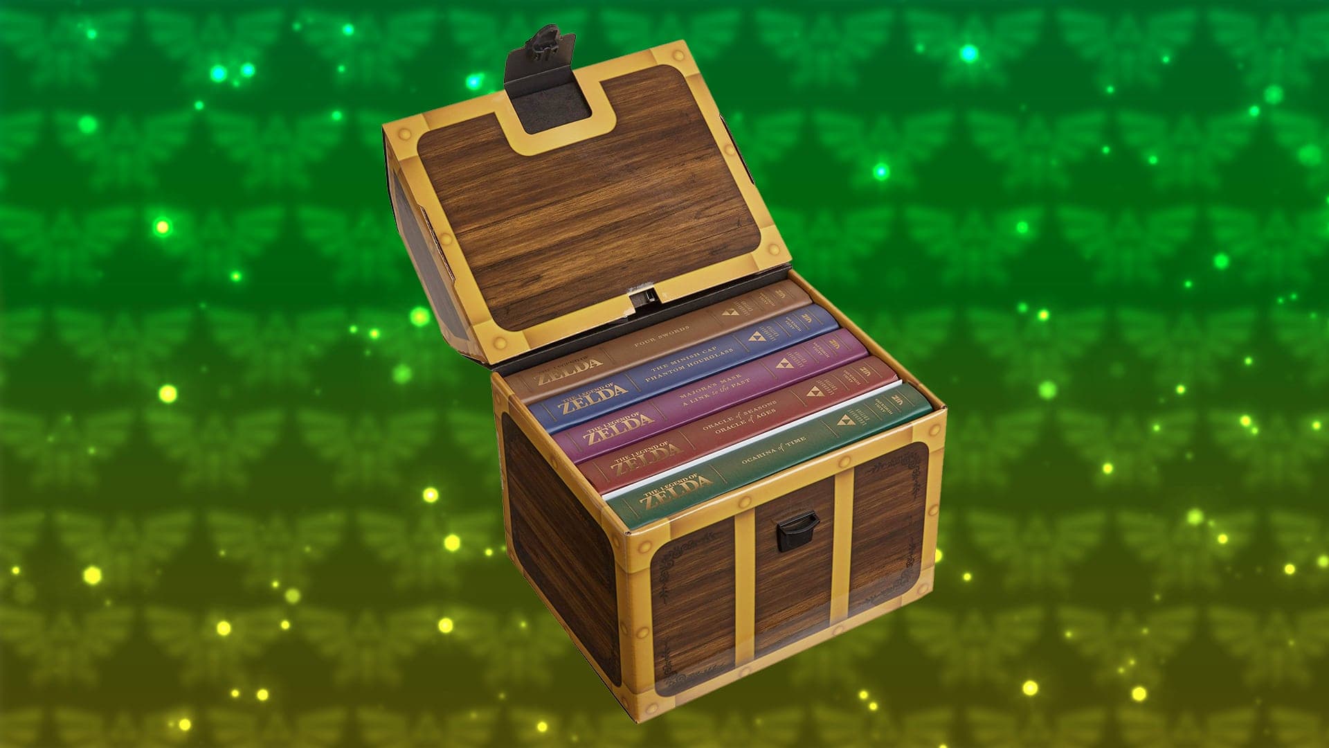 Ce coffret de luxe comprend cinq volumes, en couverture rigide, de la série de mangas The Legend of Zelda et une affiche exclusive dessinée par Akira Himekawa. Le tout empaqueté dans un coffre à trésor unique, ce qui en fait un objet de collection à placer bien en vue.