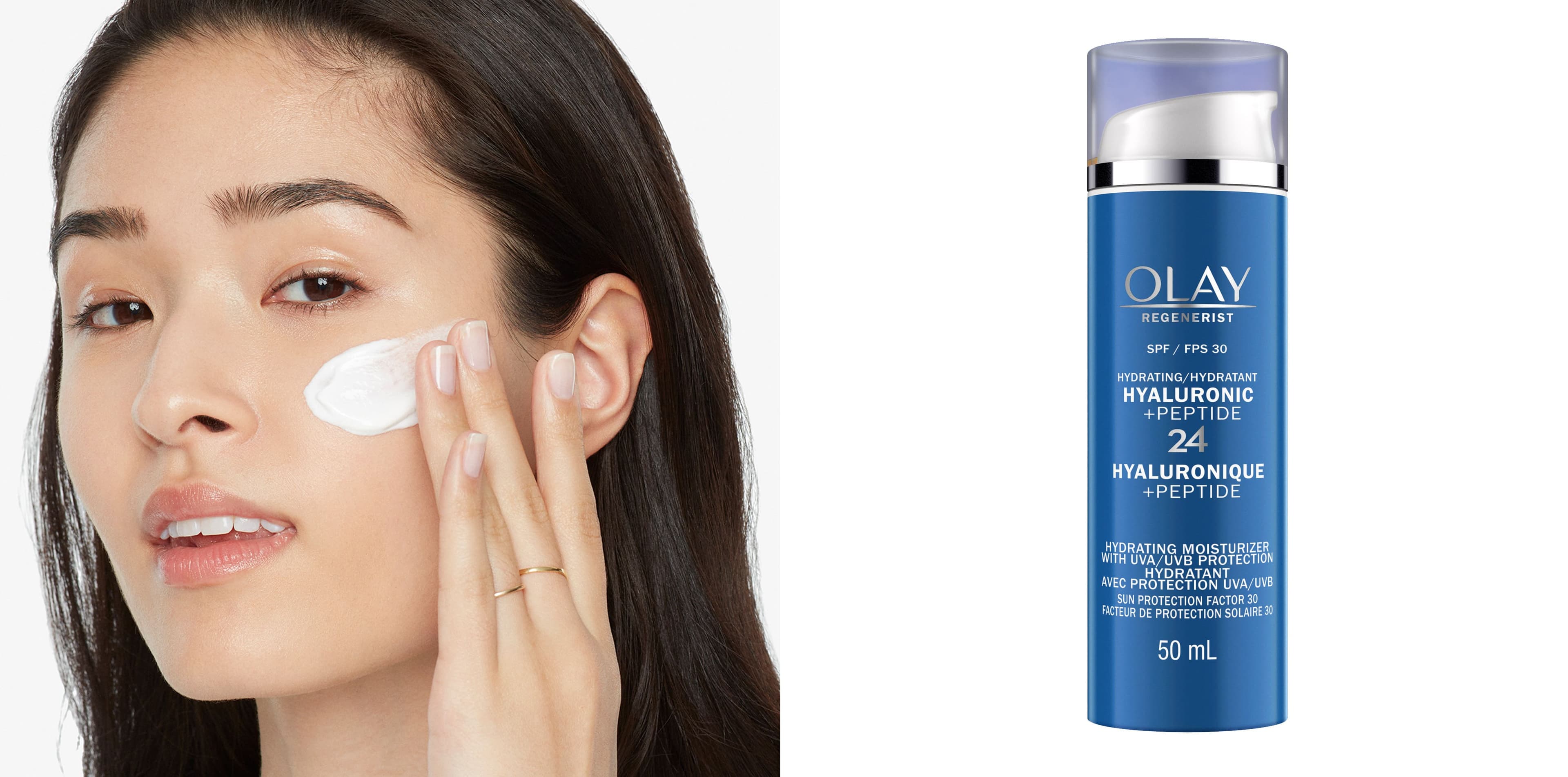 Le plus important est d’appliquer une quantité généreuse de l’hydratant Olay à l’acide Hyaluronique + Peptide 24 et FPS 30 avant de sortir de la maison et de répéter cette étape au cours de la journée.