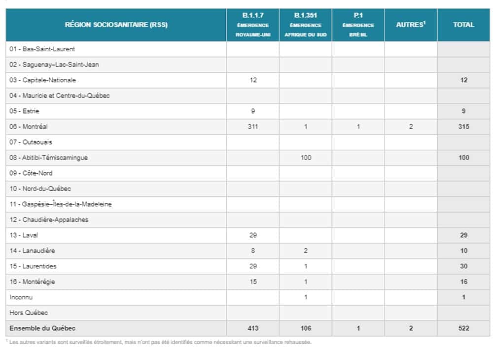 311 cas de variant anglais répertoriés à Montréal, un seul de la souche sud-africaine et un autre de la souche brésilienne.
