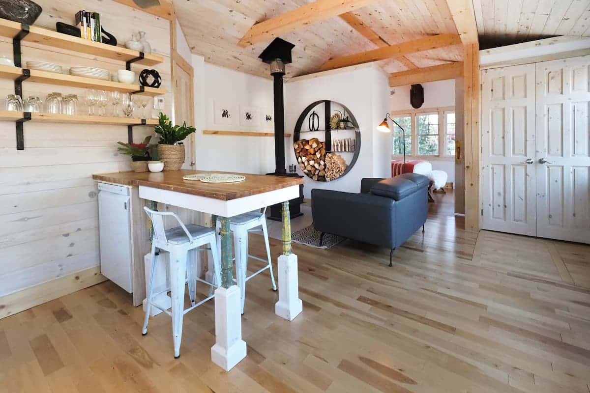 Pour une escapade de détente au cœur de la forêt, ce logement a compris la formule magique: foyer au bois, grandes fenêtres, cuisine moderne et chambre douillette. À 15 minutes de la station de ski et du centre touristique de Tremblant.
