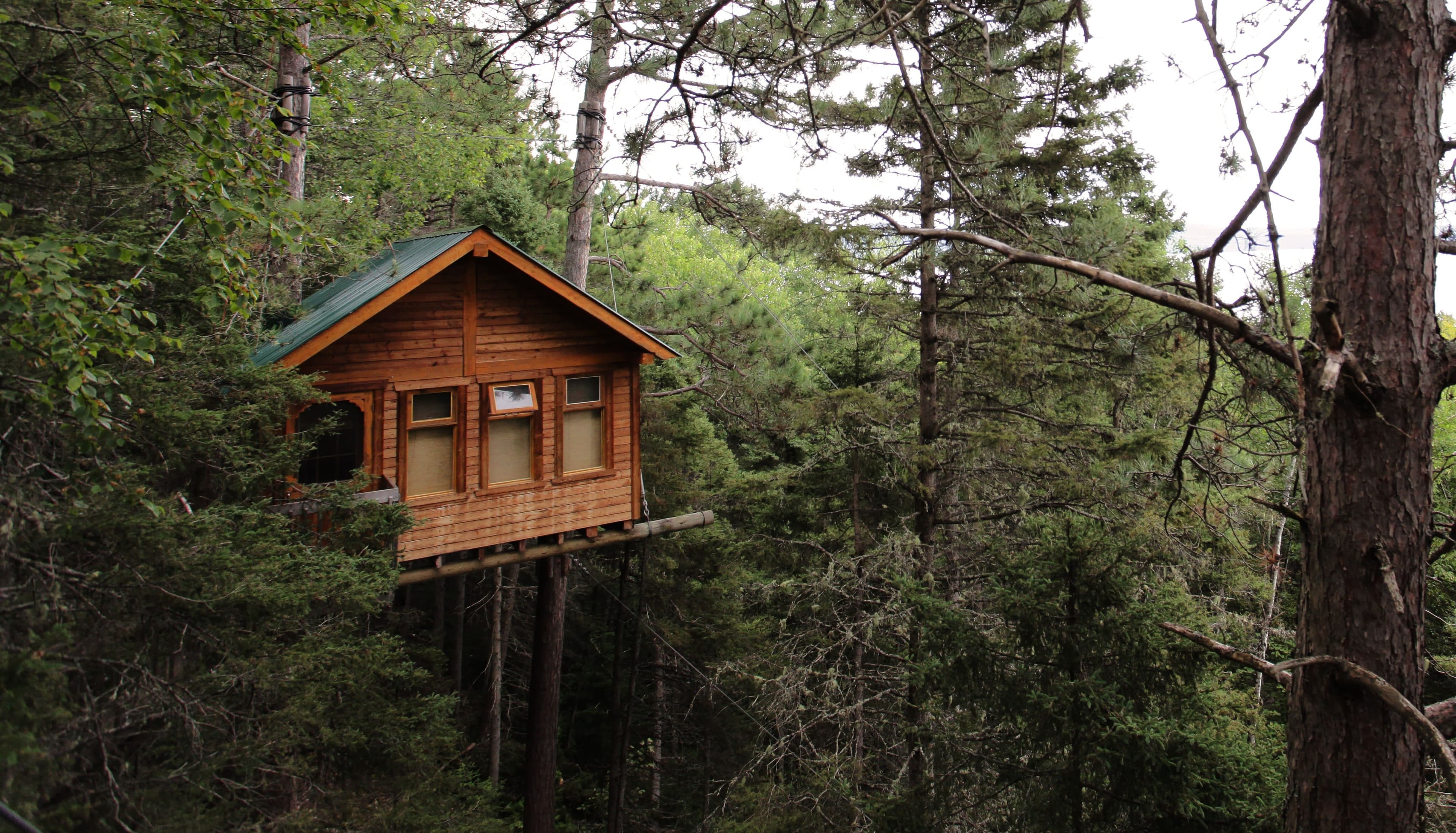 Au Parc Éco Laurentides, 20 cabanes sont juchées dans un arbre ou sur un roc. Chariot fourni pour transporter vos bagages. Batterie pour éclairage et chargement de notre téléphone. Douches à l’accueil.