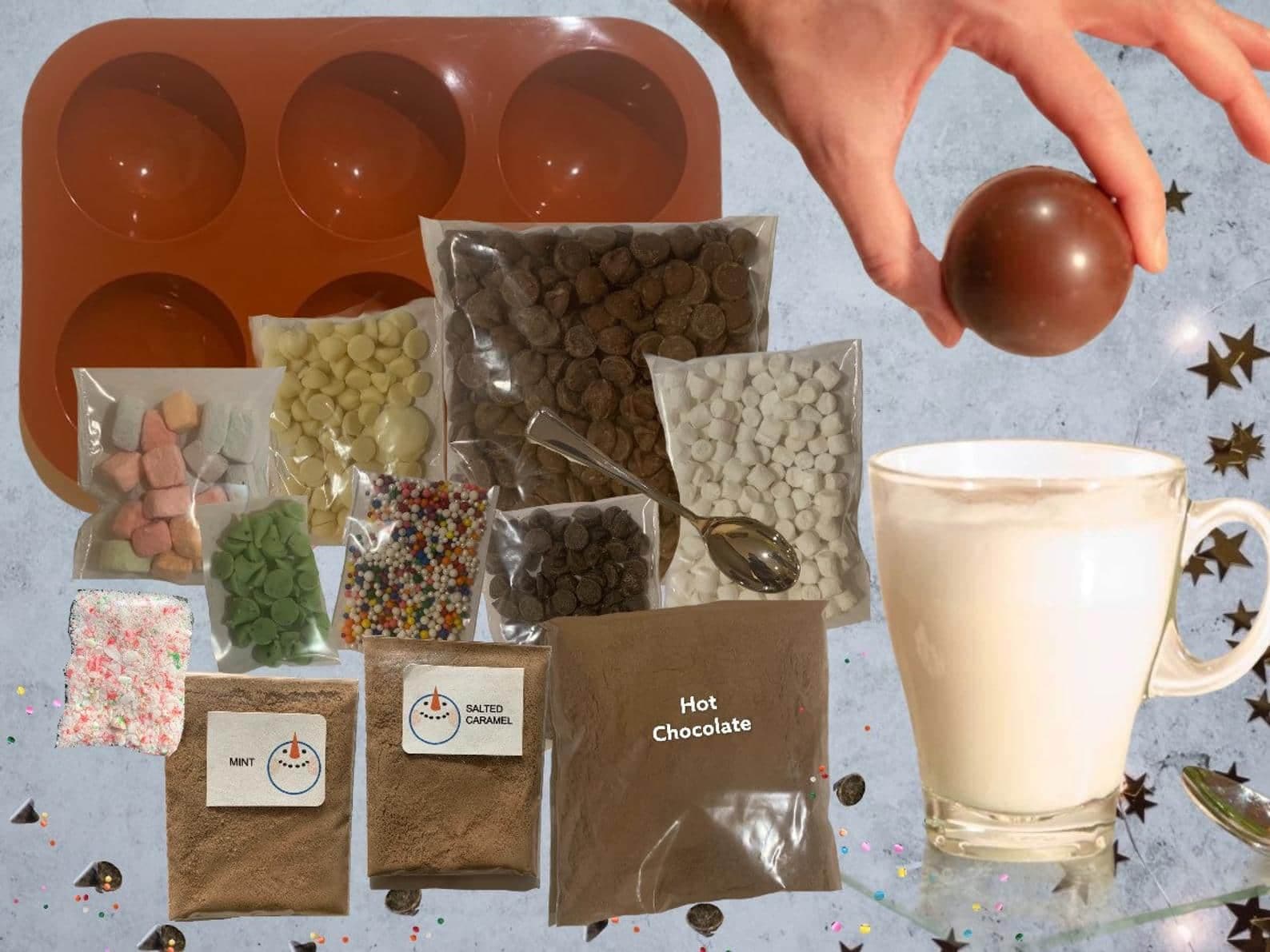 Fabriquez vous-même les fameuses bombes de chocolat chaud grâce à cet ensemble! Ce kit comprend 3 mélanges à chocolat chaud, des miniguimauves, du chocolat blanc, noir et au lait, quelques garnitures, un moule et les instructions. Vous pourrez préparer 8 bombes avec l’ensemble, ce qui vous permettra de les partager... ou non!
