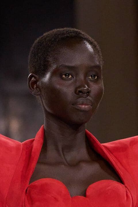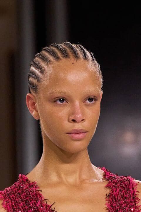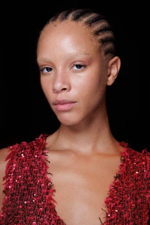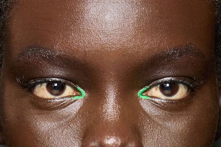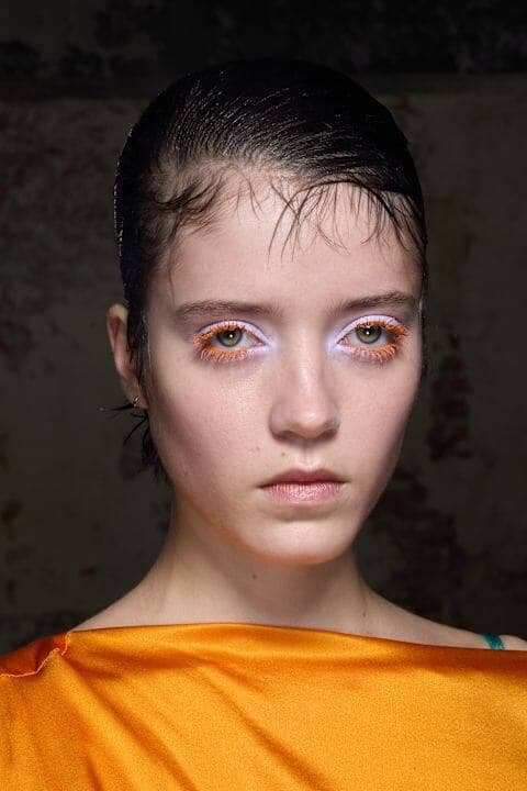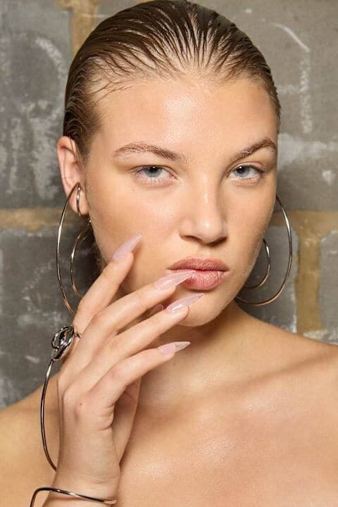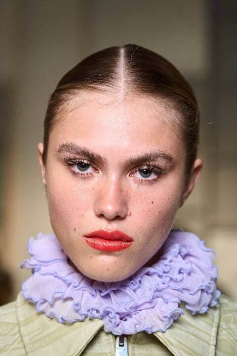 Les yeux complètement nus, ou presque, s’inscrivent dans la tendance du quiet luxury. Contrairement à ce qu’on pourrait croire, ce look minimaliste permet d’accentuer le regard. Pour reproduire cette esthétique épurée, les maquilleurs choisissent des ombres à paupières claires, très similaires au teint de la peau de leur mannequin... ou n’en utilisent tout simplement pas! Les cils sont définis à l’aide d’une simple brosse ou d’un gel, tout comme les sourcils qui sont parfois décolorés pour se fondre à la couleur du visage.