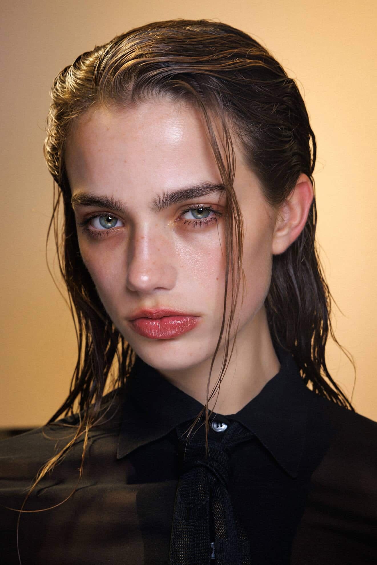 La tendance wet look, quoiqu’audacieuse, est toujours de bon goût. Pour être parfaitement glamour, on vient enduire ses cheveux, des racines jusqu'aux pointes, d’un gel ou d’un sérum brillant pour donner l’impression d’être fraîchement sortie de la douche. On appuie l’aspect lustré, au cœur de l’identité de cette tendance, en appliquant à sa peau des fards aux couleurs neutres, mais lumineuses, pour une allure naturelle, mais miroitante.