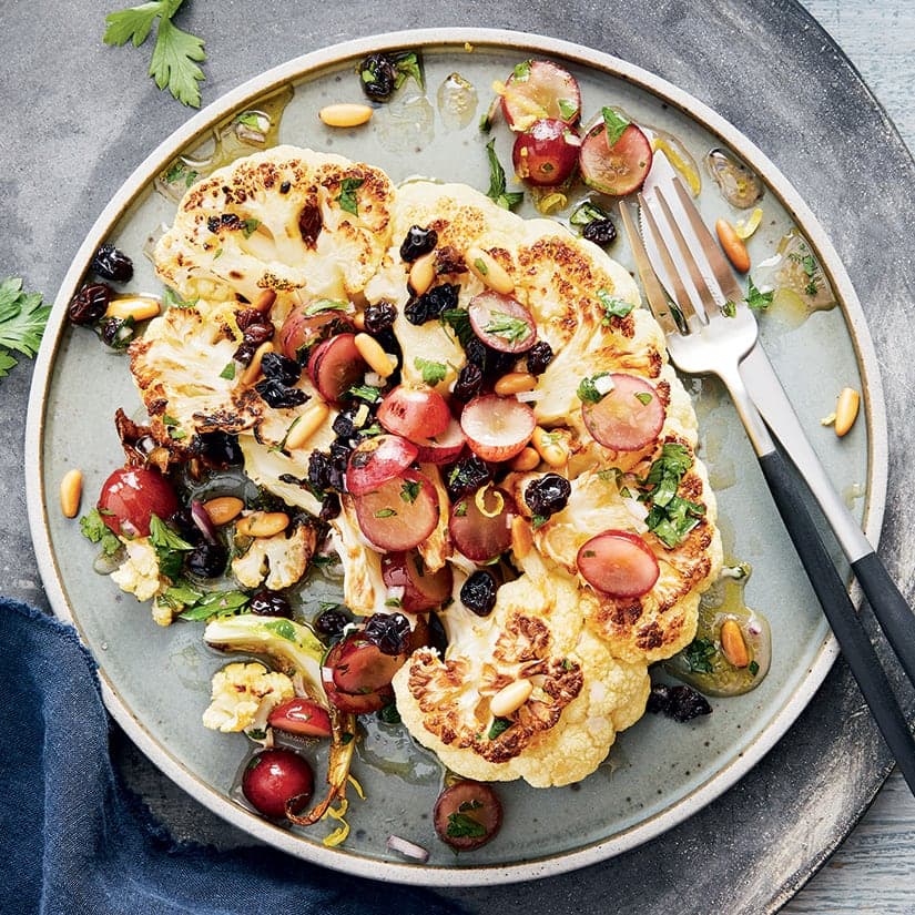 Avez-vous déjà essayé un «steak» de chou-fleur? On aime beaucoup celui-ci qui se prépare facilement et qu’on accompagne d’une relish aux raisins et noix de pin.
