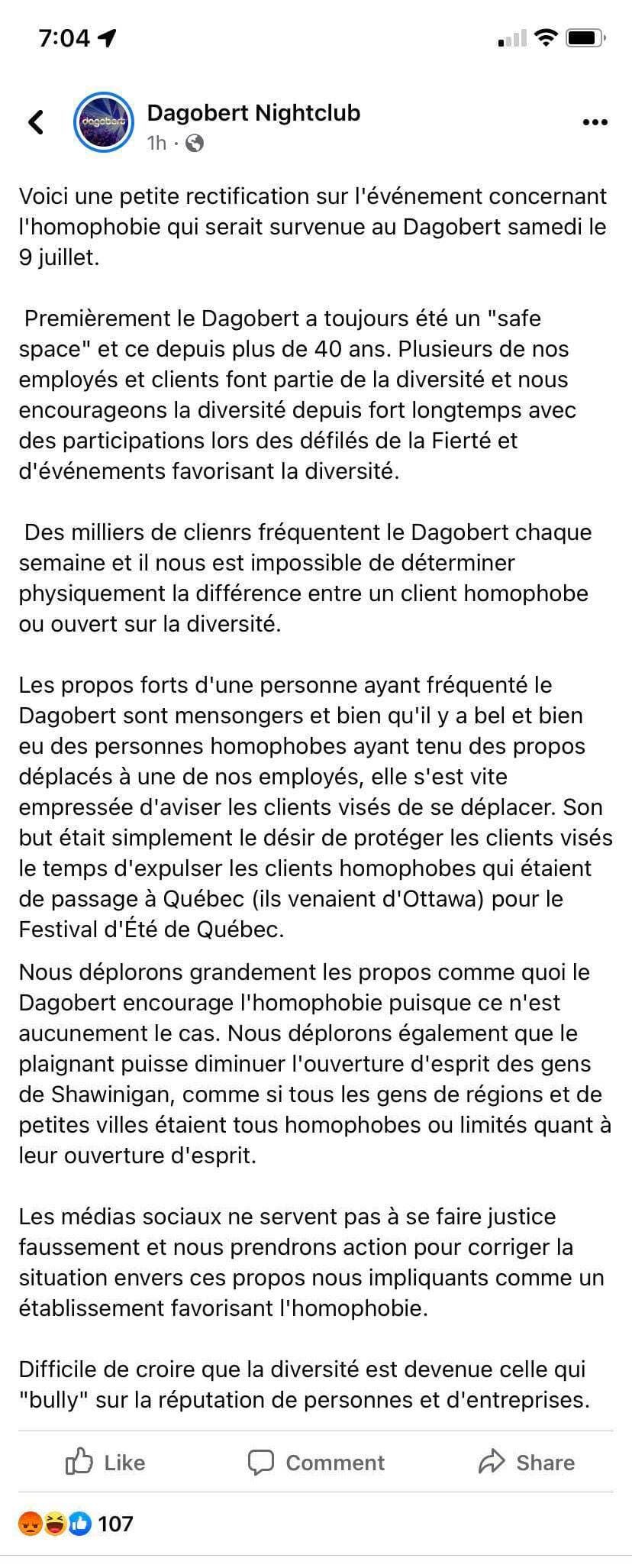 «Les propos forts d'une personne ayant fréquenté le Dagobert sont mensongers, et bien qu'il y ait bel et bien eu des personnes homophobes ayant tenu des propos déplacés à une de nos employés, elle s'est vite empressée d'aviser les clients visés de se déplacer. Son but était simplement le désir de protéger les clients visés, le temps d'expulser les clients homophobes qui étaient de passage à Québec (ils venaient d'Ottawa) pour le Festival d'été de Québec.»