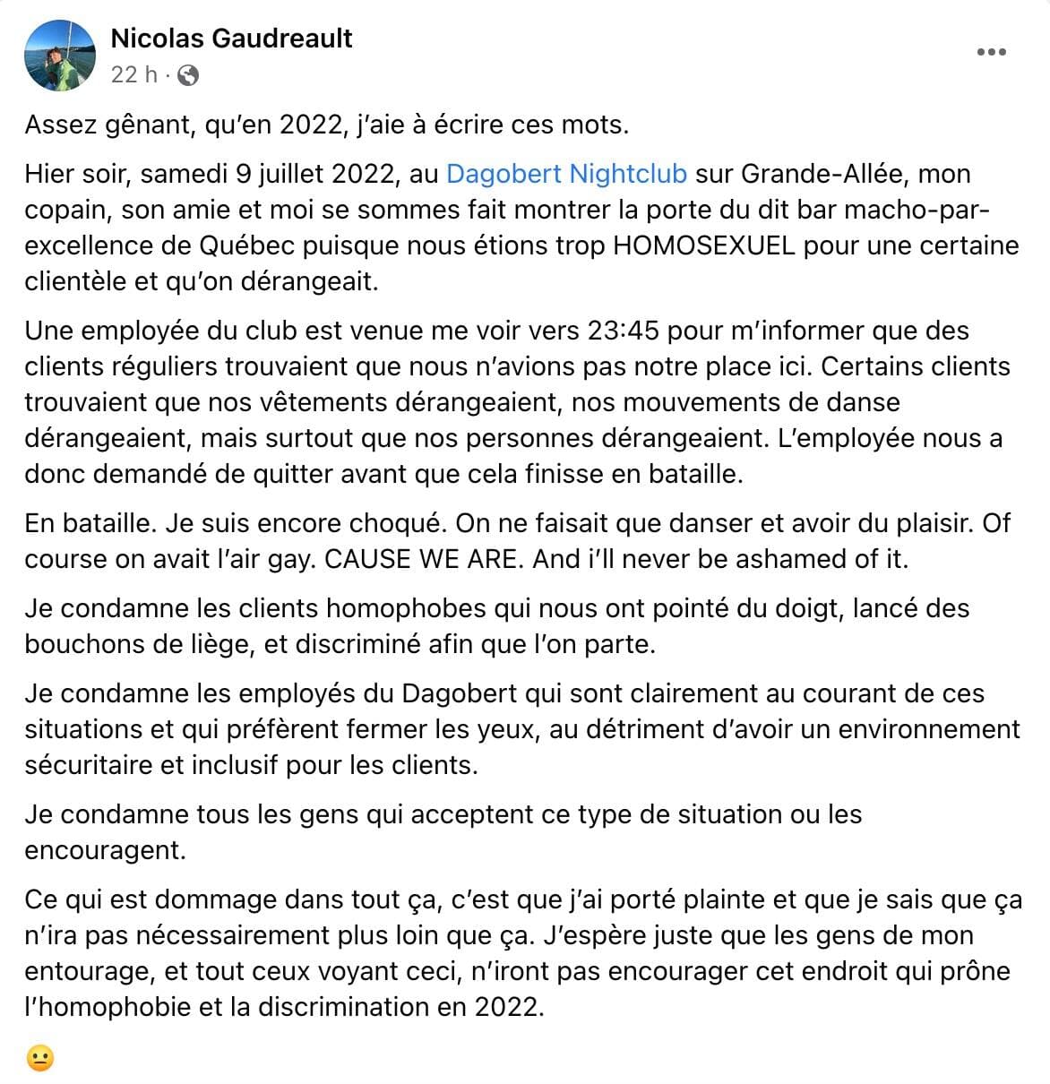 «Une employée du club est venue me voir vers 23 h 45 pour m’informer que des clients réguliers trouvaient que nous n’avions pas notre place ici. Certains clients trouvaient que nos vêtements dérangeaient, que nos mouvements de danse dérangeaient, mais surtout que nos personnes dérangeaient. L’employée nous a donc demandé de quitter avant que cela finisse en bataille», écrit-il.
