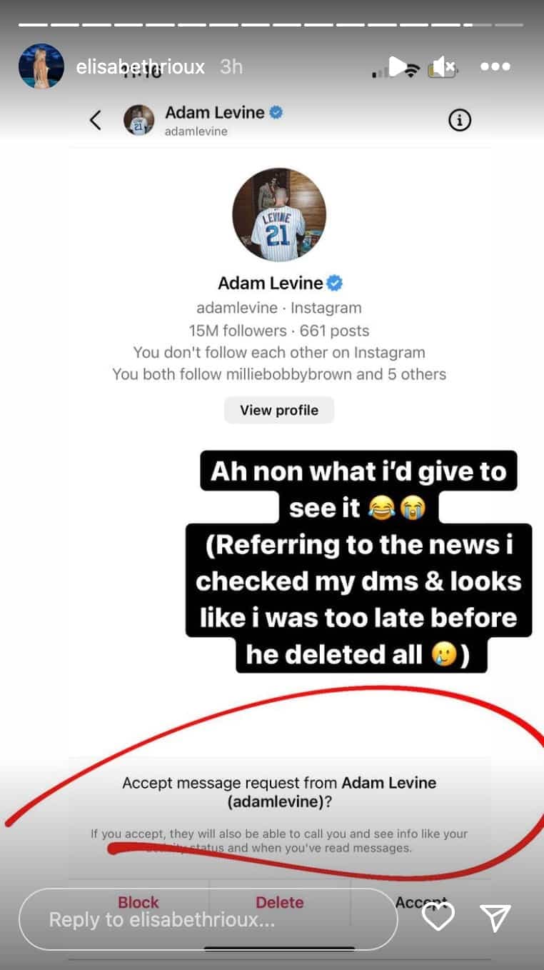 Dans une story qu’elle a publié jeudi, la jeune femme a partagé une capture d’écran de sa boîte de réception Instagram, dans laquelle elle avait une demande de message de Levine.