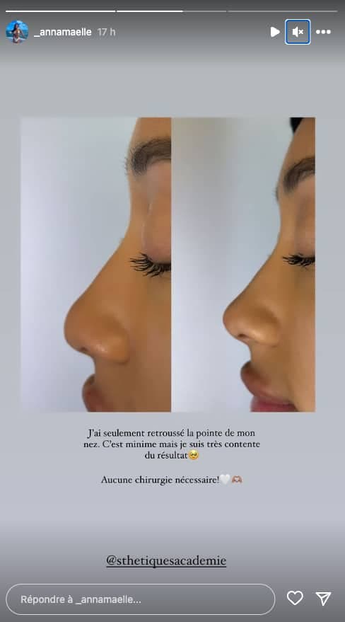 Comme expliqué par Anna-Maëlle, dans une Story Instagram dévoilant le résultat final, les injections ont retroussé le bout de son nez, sans aucune chirurgie nécessaire.
