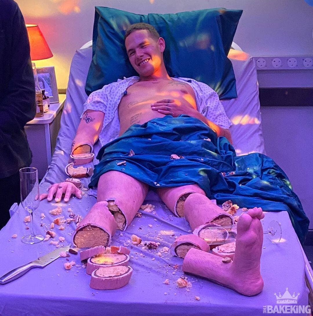 Le gâteau grandeur nature représente un homme vêtu d’une jaquette couché dans un lit d'hôpital. Plusieurs détails font en sorte qu’il est presque impossible de différencier le dessert d’une vraie personne: des tatouages aux ongles, en passant par le poil des jambes.