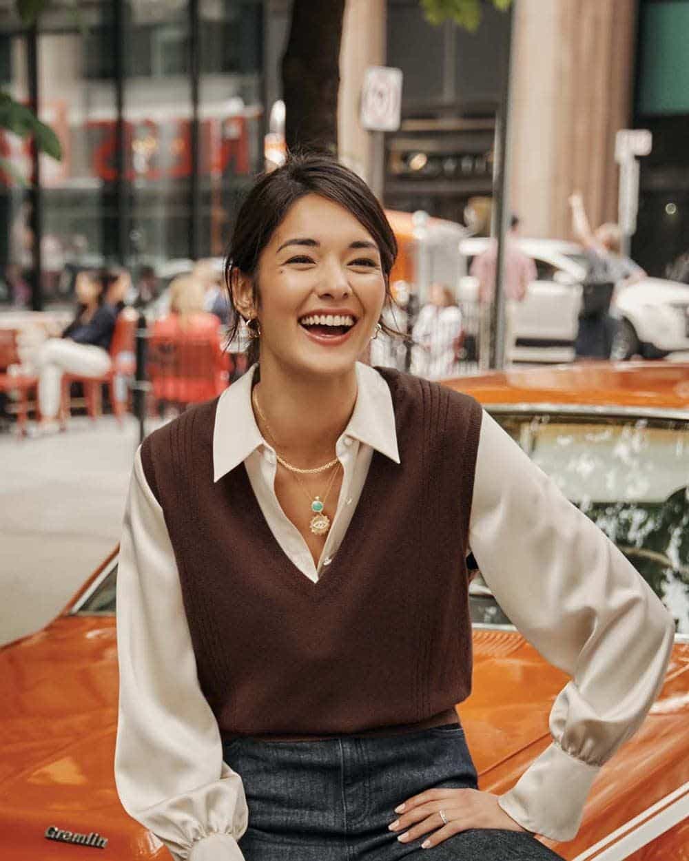 Pour une raison que seule la mode pourrait inventer, le pull en V avait perdu de son charme auprès des fashionistas. Il refait néanmoins surface, à la faveur du retour en grâce du look preppy, ce style des étudiants américains des années 1960 (mais que les étudiants et étudiantes d’Oxbridge avaient déjà popularisé dans les années 1930).