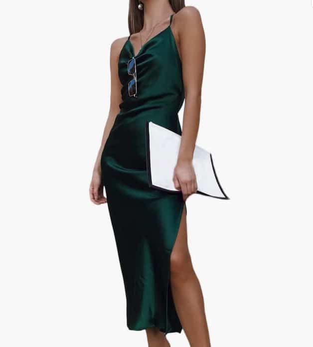 Sur Amazon, on retrouve une robe de satin parfaite pour adopter la tendance. Elle est d'ailleurs offerte dans le coloris de l’heure, le vert forêt.