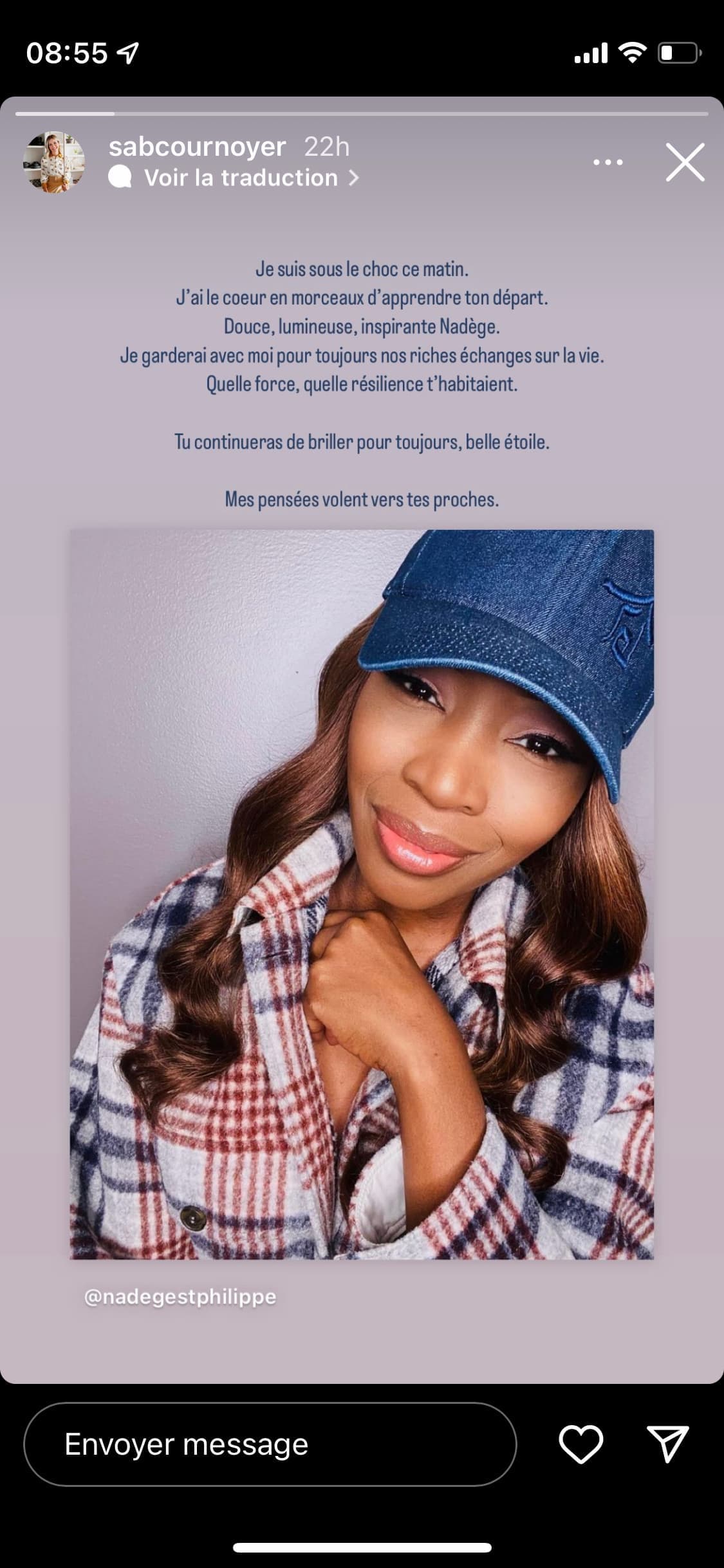 Triste nouvelle ce matin. Beaucoup trop jeune. Nadège St-Philippe nous aura marqué tant par sa générosité, dans la vie comme avec le public, que par sa lumineuse résilience. Sincères condoléances à sa famille, à ses proches et à toutes et tous ses collègues de @tvanouvelles. https://t.co/F5oNXPzpmq