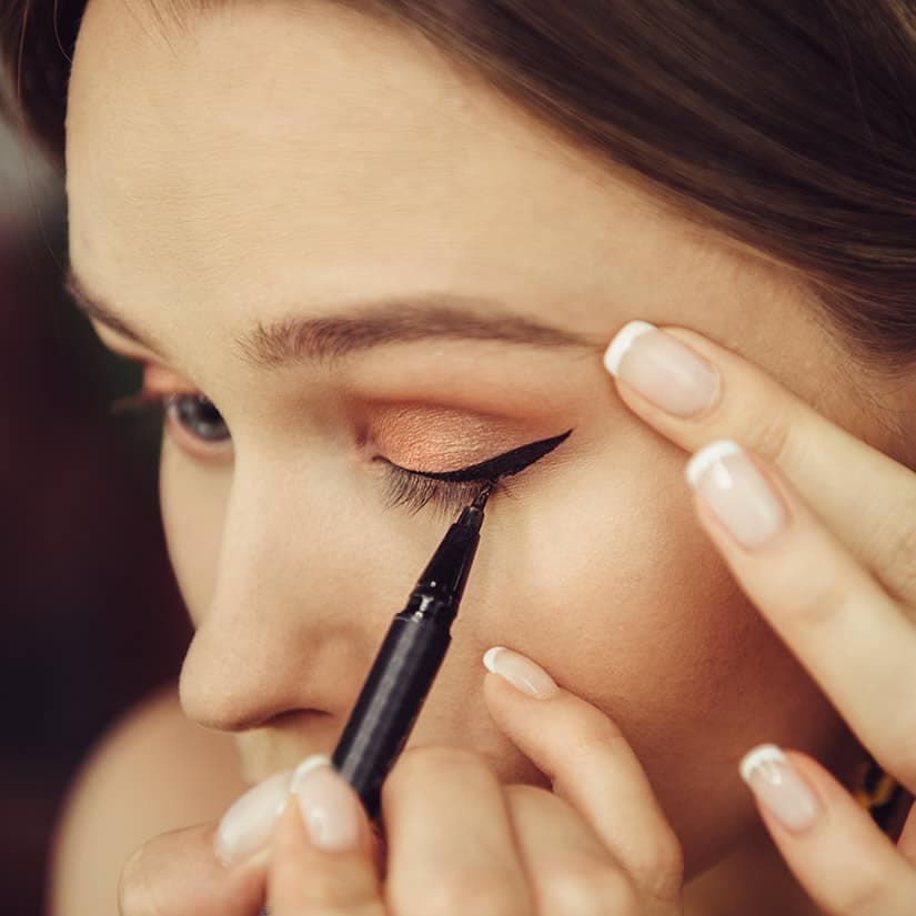 Les plus habituées peuvent s’essayer avec un pinceau et un ligneur en gel qui, bien que l’application soit plus ardue, permet aussi de personnaliser la forme du tracé et tient souvent plus longtemps sur l’œil.