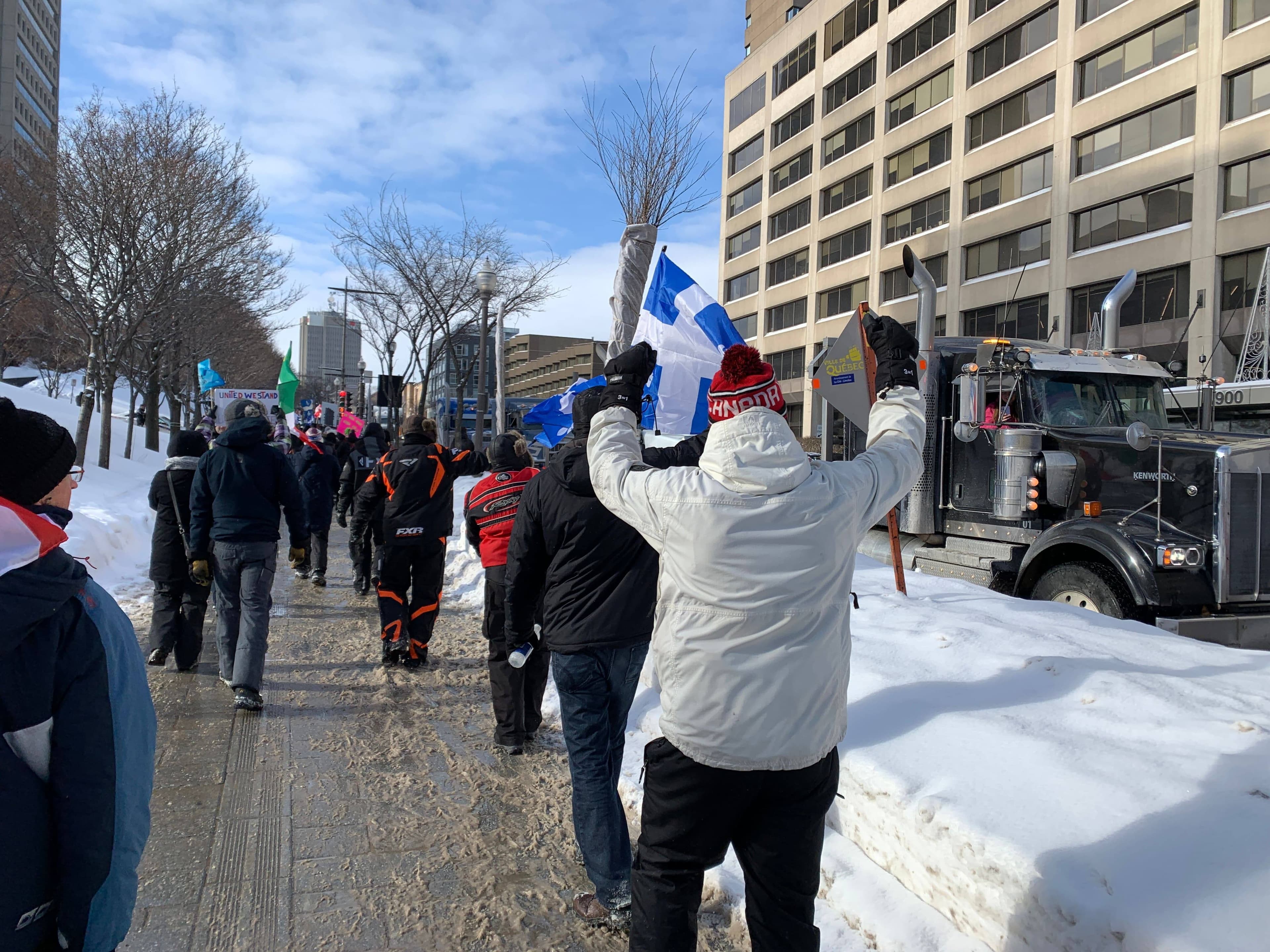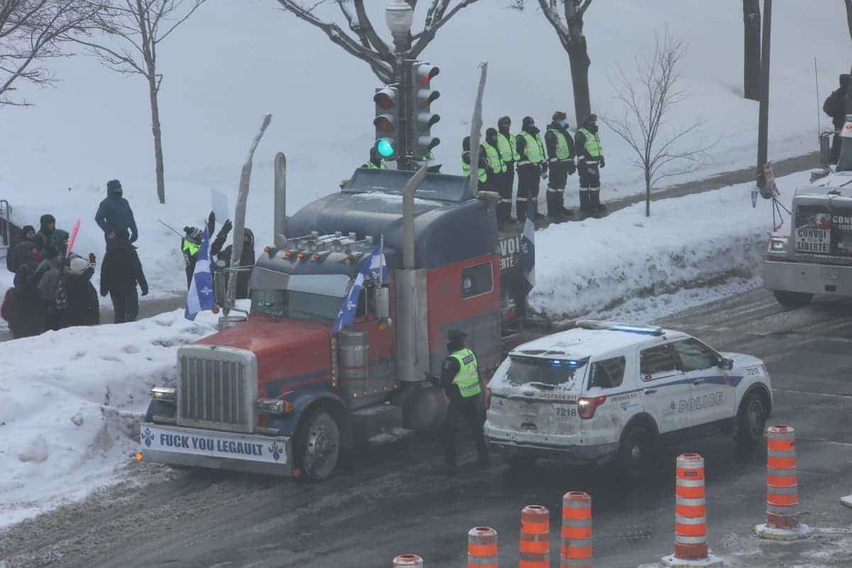 22h15 | Alors que les manifestants sont partis graduellement dans une ambiance festive en soirée, le SPVQ a annoncé qu'il tolérerait les poids lourds stationnés sur le boulevard René-Lévesque pour la nuit. Cependant, aucune infraction ne sera tolérée. Le concert de klaxons continuait de retentir aux abords de l'Assemblée nationale. Un homme de 31 ans a été arrêté pour entrave et sa camionnette a été remorquée. Au total, les agents ont remis 11 constats en vertu de la réglementation municipale sur la paix et le bon ordre ainsi que 10 constats en vertu du Code de la sécurité routière.