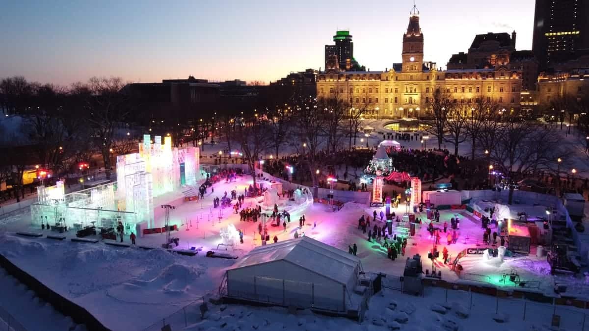 11h45 | La fontaine de Tourny est scindée en deux. D’une part, les manifestants écoutent solennellement l’hymne national canadien, avant d’enchaîner sur des airs de Guns N Roses. De l’autre, les visiteurs du Carnaval font la file pour découvrir le palais de Bonhomme avec une trame de fond de musique québécoise, protégés par des agents de sécurité.