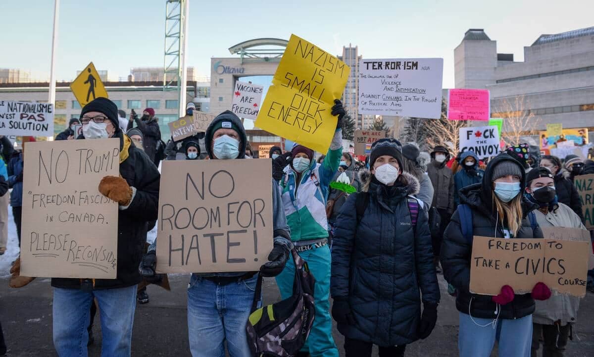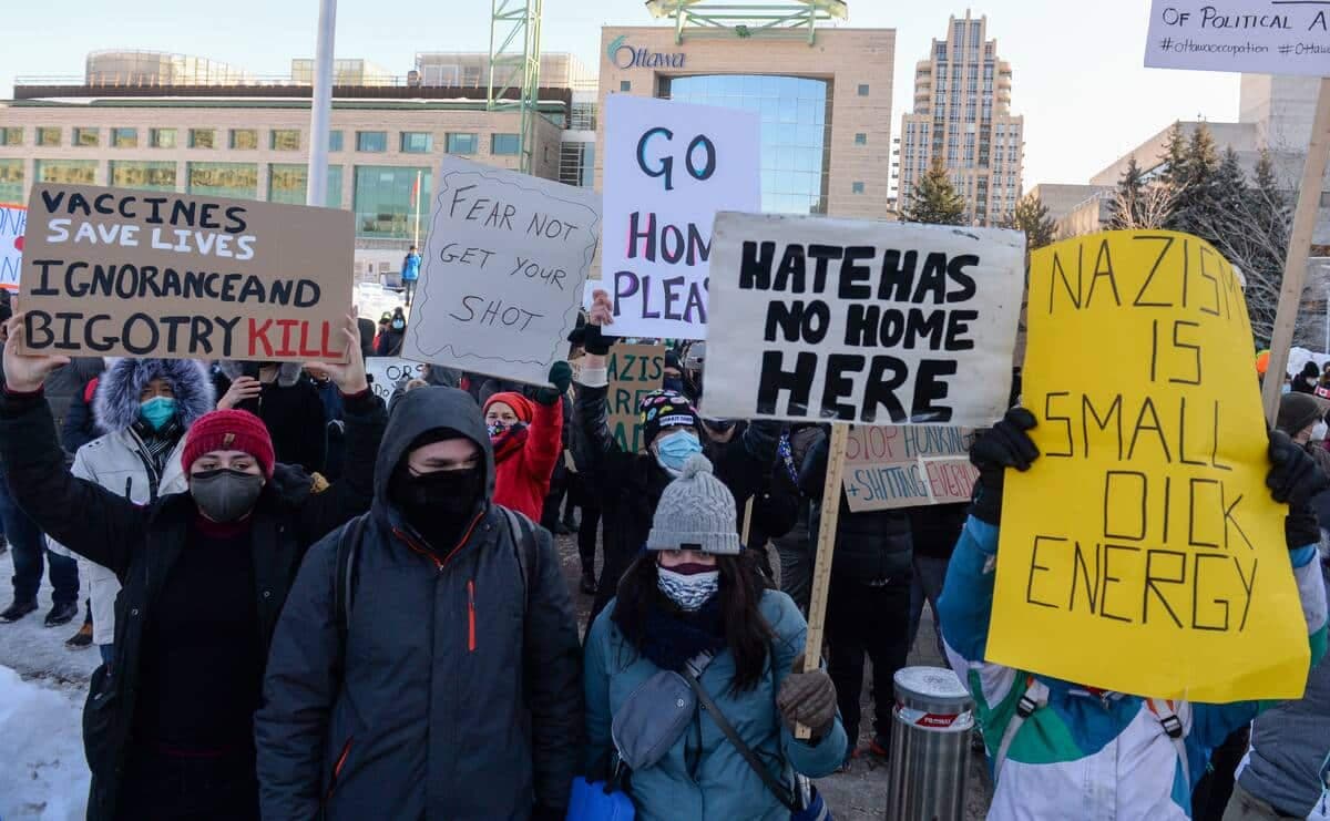 16h02 | Plusieurs dizaines de personnes se sont réunis samedi après-midi devant l’Hôtel de Ville d’Ottawa pour manifester contre le mouvement de protestation qui durent depuis maintenant une semaine aux alentours du Parlement du Canada.