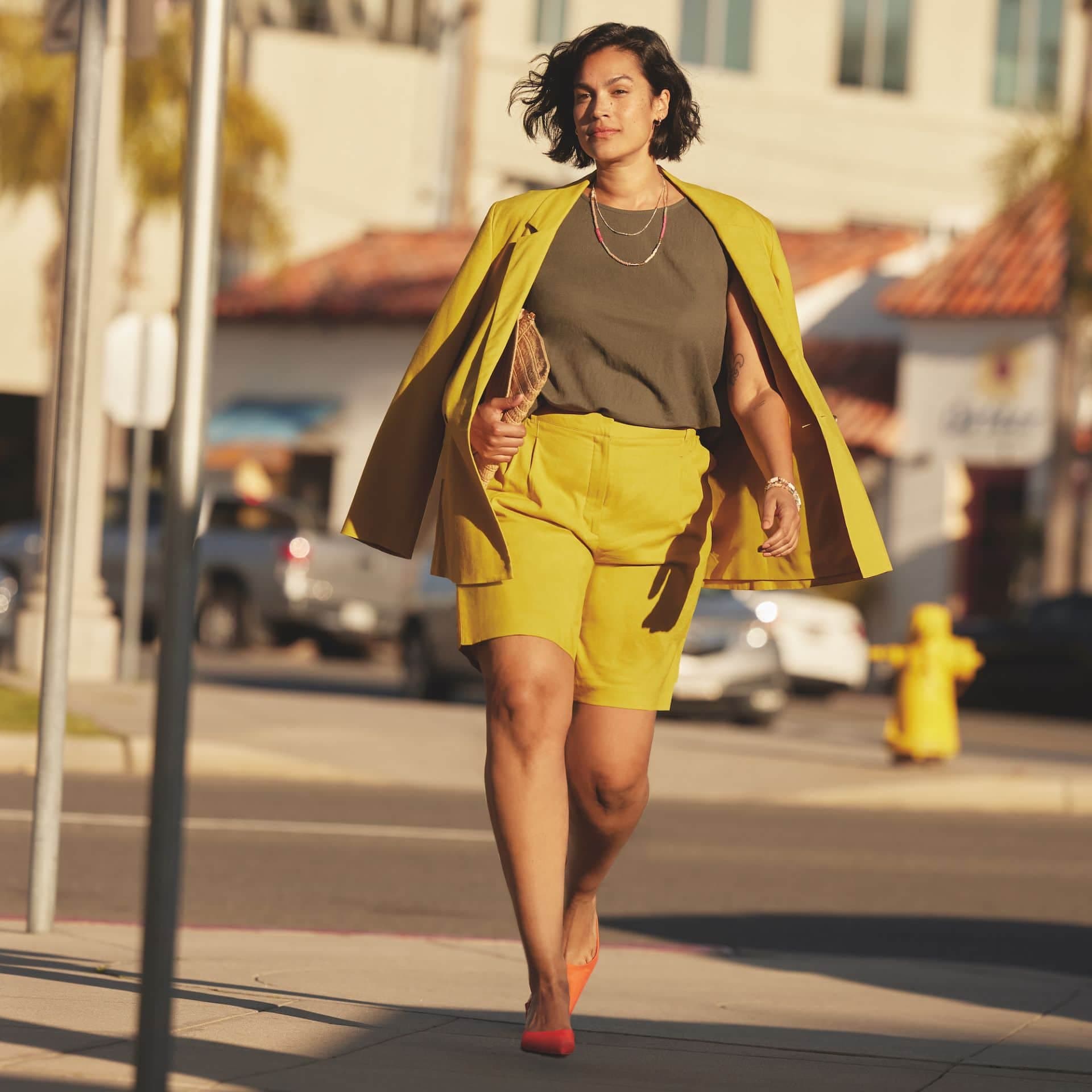 On a toujours eu un faible pour le veston agencé au short, qui ajoute une touche décontractée à un ensemble structuré. Et la couleur donne un coup de pep! Point bonus pour les escarpins – funky, sans voler la vedette!