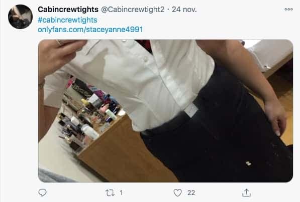 Par exemple, le compte Twitter @Cabincrewtight2 sert d’outil promotionnel à une certaine StaceyAnne, qui se spécialise dans le fétiche du collant sur OnlyFans.