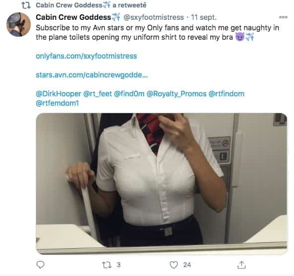Une autre, Cabin Crew Goddess, a le même motus operandi: elle se sert de Twitter pour promouvoir son OnlyFans.