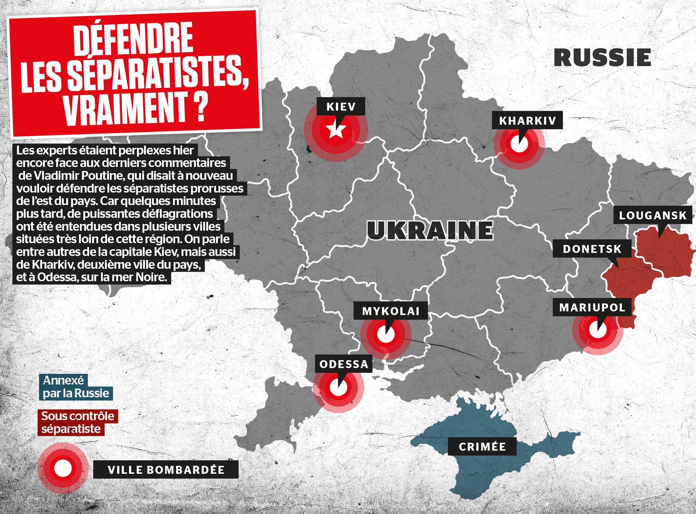 De son côté, le ministre ukrainien des Affaires étrangères, Dmytro Kouleba, a annoncé en fin de soirée le début d’une « invasion de grande ampleur de la Russie », et des frappes sur plusieurs villes du pays, après une série d’explosions.
