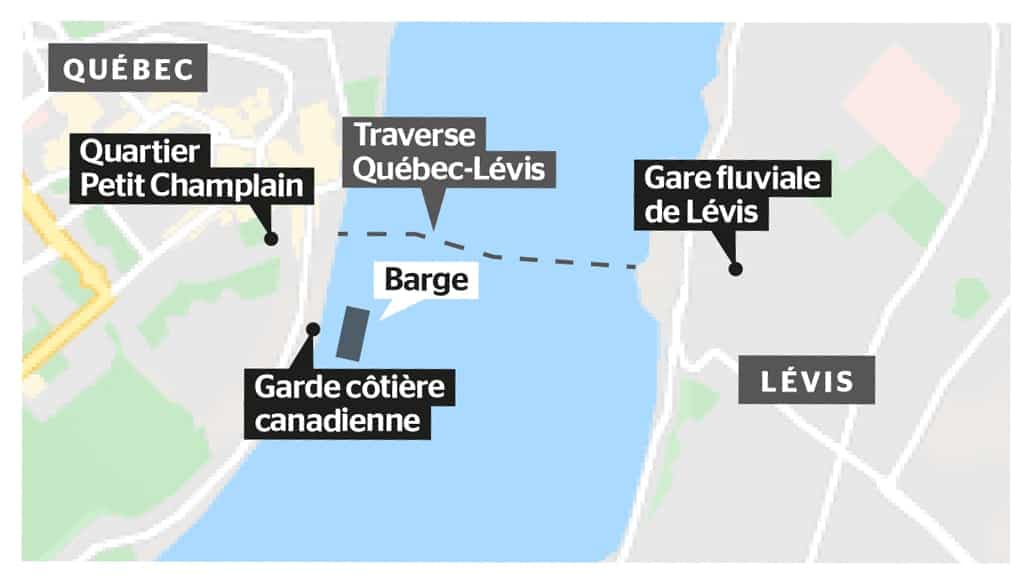 Des forages sous-marins pour le tracé central du troisième lien sont en cours de réalisation, dans le lit du fleuve, près de la gare fluviale de Québec.