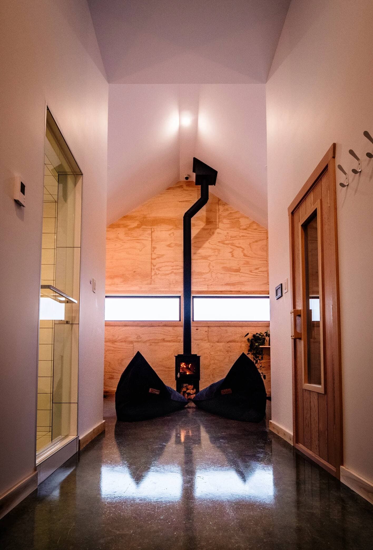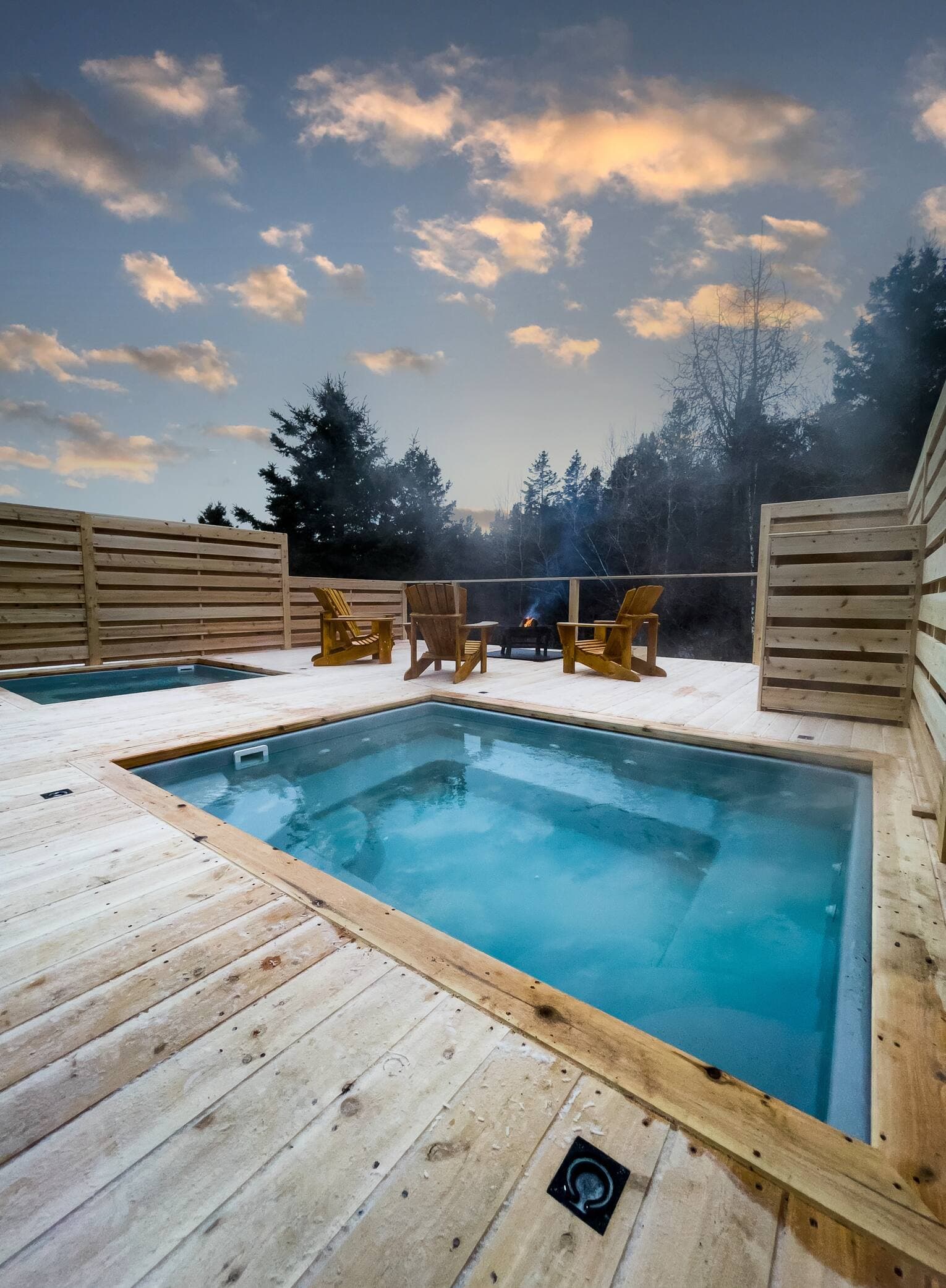 La station thermale des [ÈST] éco-cabines n'a rien à envier aux plus grands spas! Le circuit comprend un spacieux bain chaud et cuve froid ainsi qu'un sauna sec et un hammam à l'eucalyptus. Entre les circuits, il est possible de poursuivre la relaxation, un livre à la main, dans la zone de détente extérieure ou intérieure.