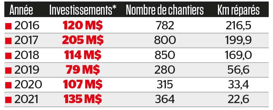 * Les investissements en infrastructures regroupent aussi bien la réfection du revêtement que des infrastructures souterraines, celles-ci étant plus coûteuses à restaurer. C’est pourquoi l’investissement est élevé même quand les kilomètres couverts sont moins nombreux. Source : Ville de Québec.