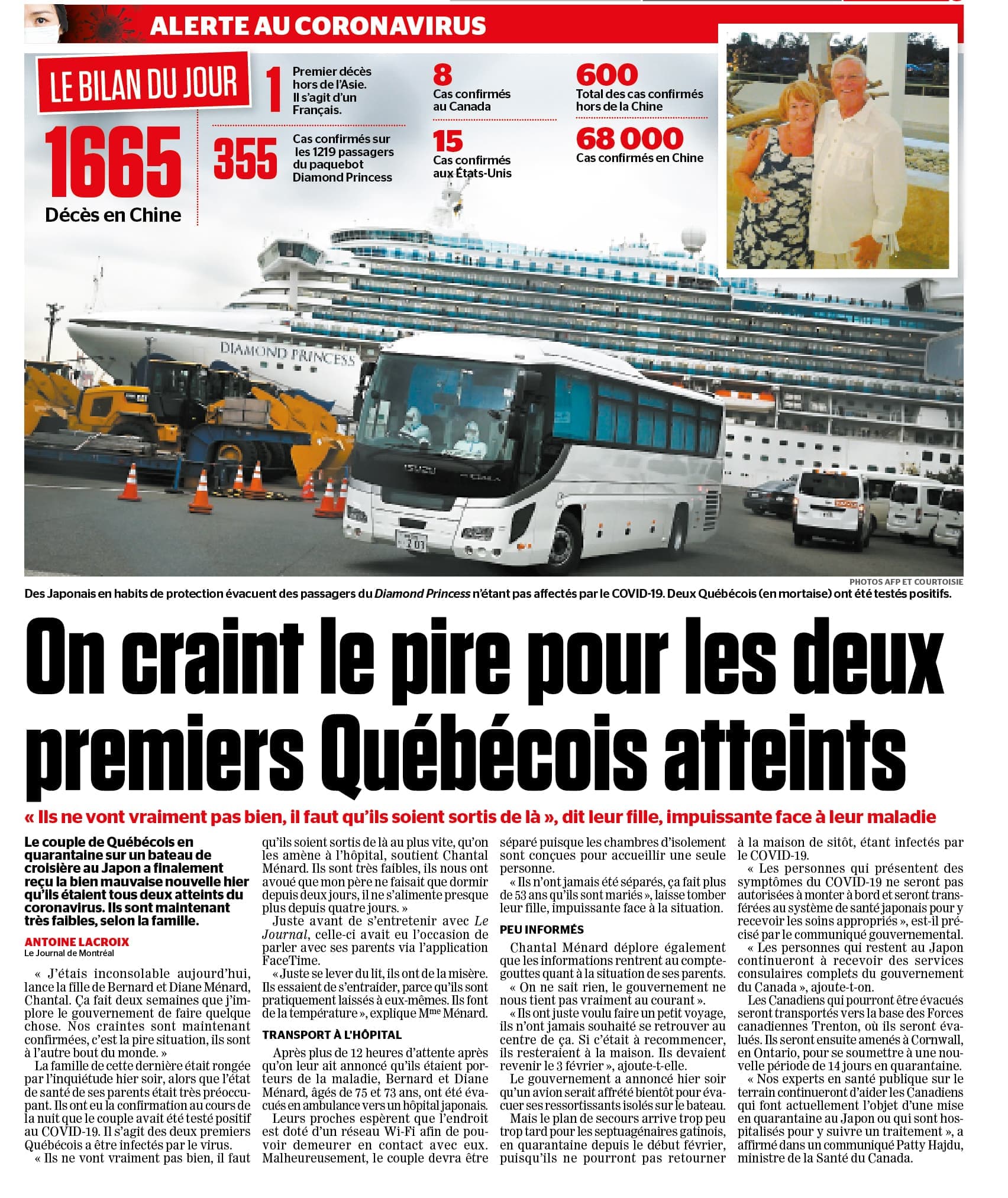 Deux Québécois partis faire une croisière à bord du Diamond Princess ont reçu le diagnostic et ont appris qu’ils étaient tous les deux atteints de la COVID-19, ce qui en faisait les deux premiers Québécois à être frappés par la maladie. Ils étaient coincés depuis déjà deux semaines sur le paquebot, qui était en quarantaine. On recensait 355 cas confirmés sur les 1219 passagers de ce bateau de croisière.