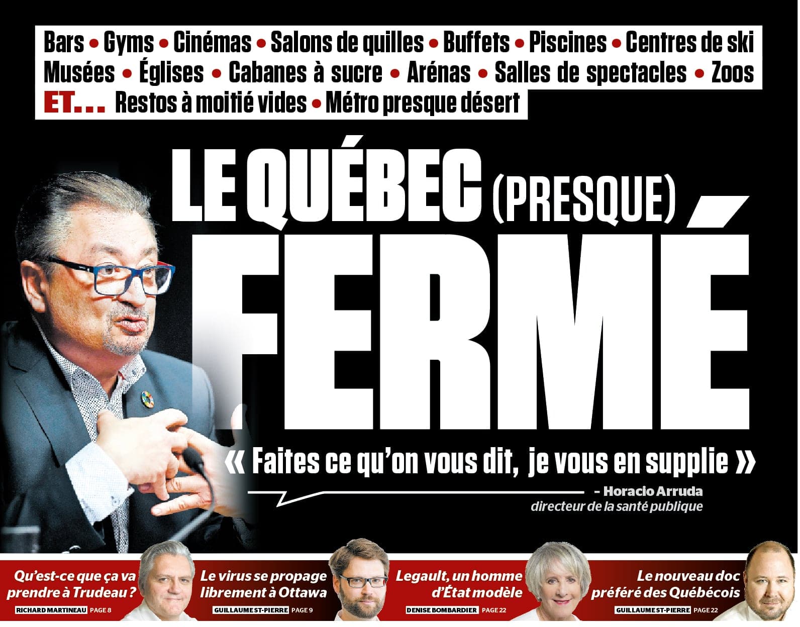 Le Québec se met sur pause pour la première fois: le gouvernement annonce la fermeture des bars, des gymnases, des cabanes à sucre, des salles de spectacle, des piscines, des arénas et des centres de ski. Les restaurants diminuent leur capacité de moitié. Les églises annulent toutes leurs activités, y compris les messes. Les Québécois sont incités à maintenir une distance d’au moins 1 mètre entre eux et à limiter leurs déplacements. De son côté, Justin Trudeau annonce la fermeture des frontières avec tous les pays, sauf les États-Unis. À ce moment-ci, le port des masques de protection n’est pas encore recommandé par le gouvernement.