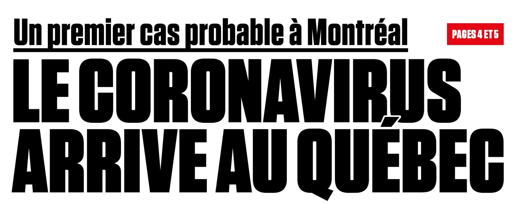Un tout premier cas de COVID-19 est détecté à Montréal. Une femme de 41 ans qui revenait d’un voyage en Iran a été déclarée positive et est en isolement à son domicile. À l’époque, la ministre de la Santé du Québec, Danielle McCann, dit qu’il n’y a «pas lieu de s’inquiéter». Quatre hôpitaux sont désignés pour accueillir et soigner les patients atteints de la COVID-19.