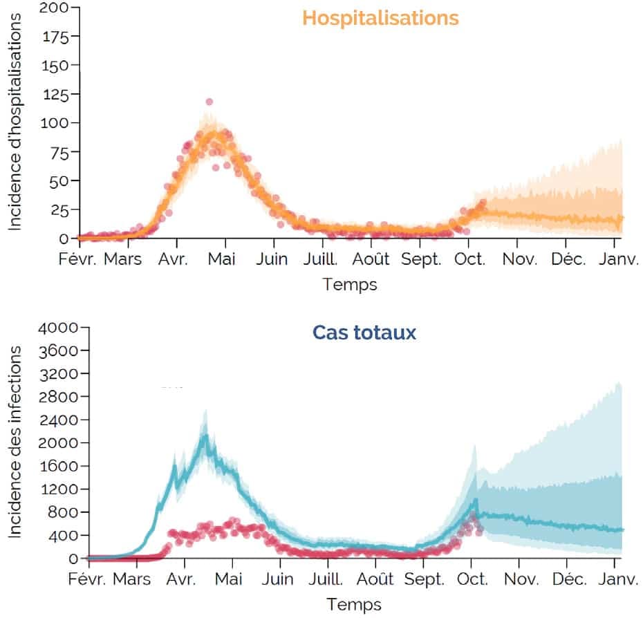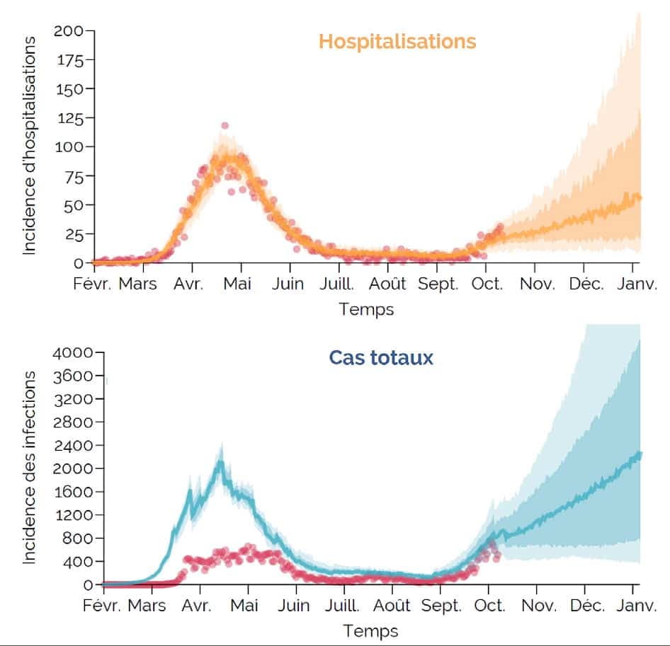 Selon leurs projections, sans aucune nouvelle mesure, le nombre de nouveaux cas aurait augmenté de façon « exponentielle », pour dépasser les 4000 par jour au cours du mois de novembre. D’ici la fin de l’année, plus de 200 hospitalisations et une centaine de nouveaux décès auraient pu être enregistrés.