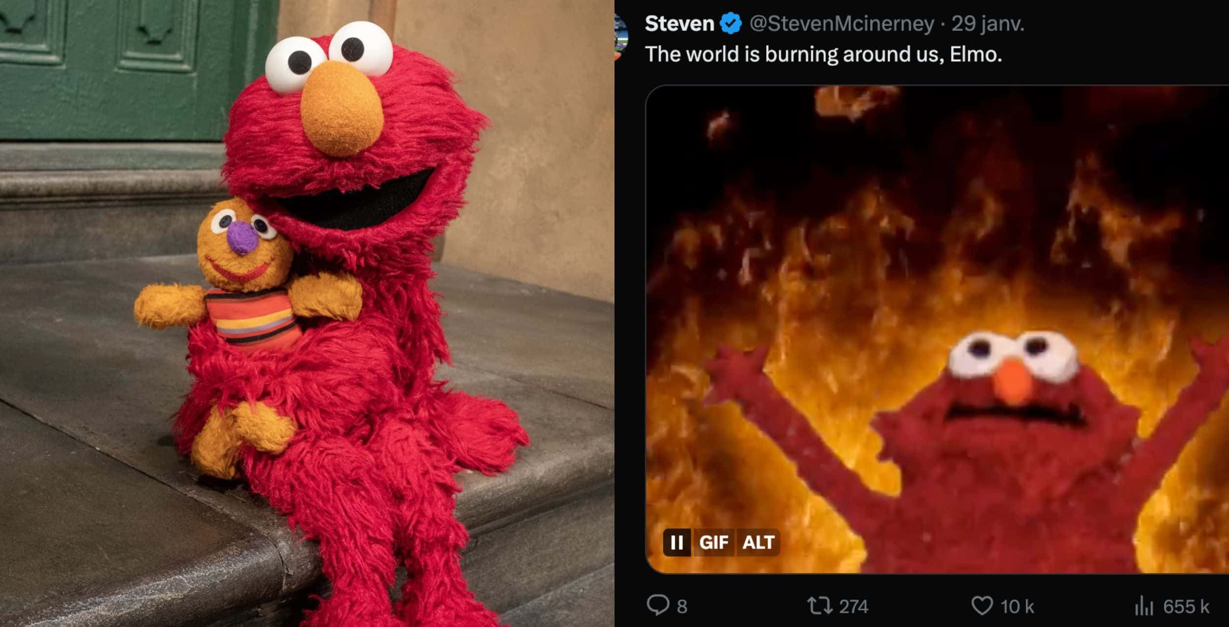 The world is burning, Elmo. No amount of tickles can fix this.