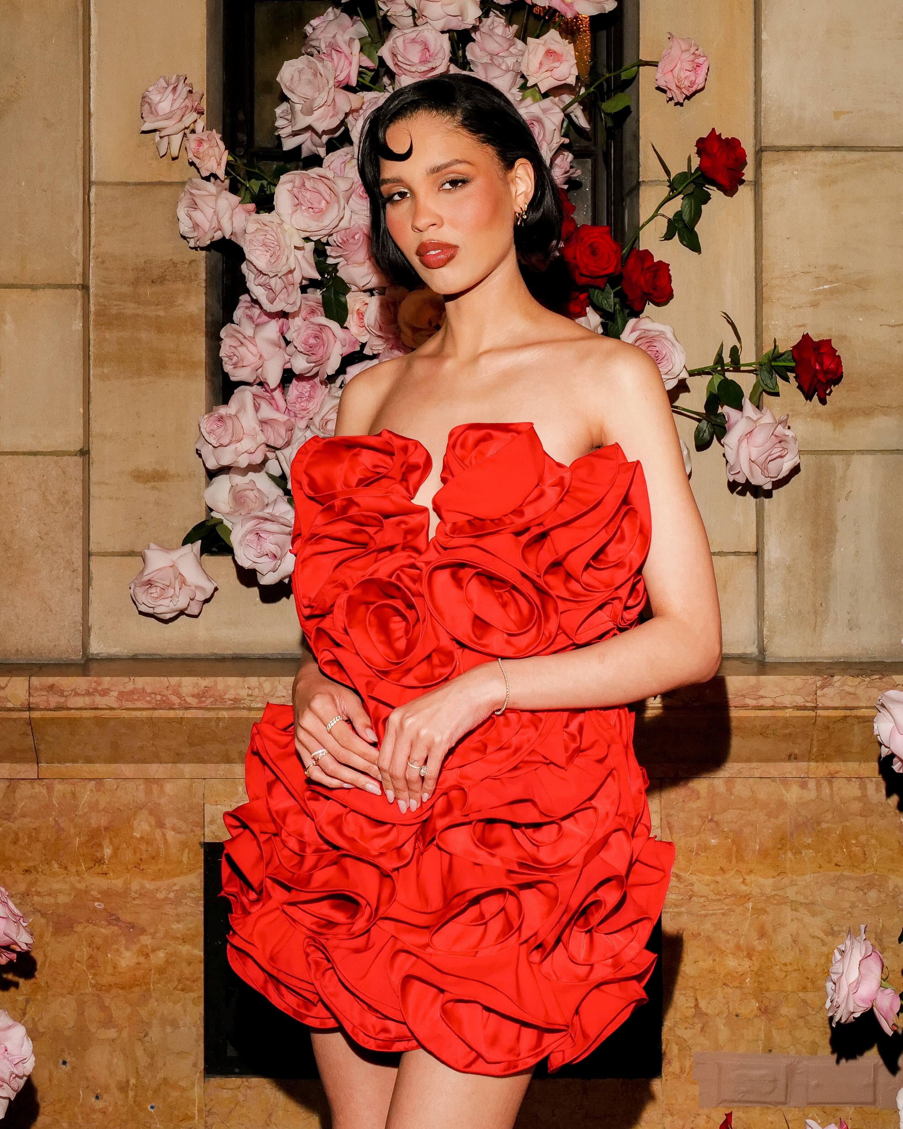 Nos looks coups de cœur? Valentina Sampaio, qui porte le majestueux trench en cuir bordeaux, pièce phare de la collection; Iris Law, dans la robe midi rouge ornée de fleurs au niveau du buste; Nara Smith, dans la robe courte volantée qui évoque un bouquet de roses; et enfin, Irina Shayk, qui a misé sur un élégant blazer noir structuré avec la casquette au foulard intégré. Le look de Chloë Sevigny, qui s'anime autour de la robe ajustée à l'effigie de l'imprimé de roses, a lui aussi fait tourner les têtes.