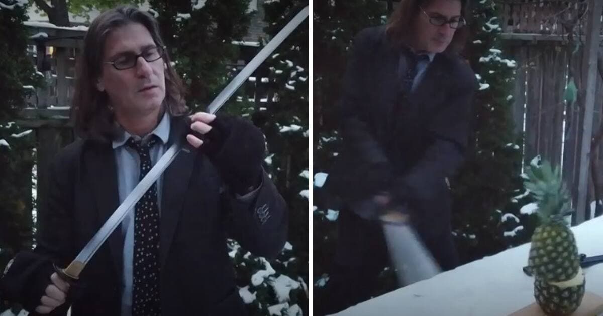 Après avoir reçu son arme en vingt-quatre heures, il l’a utilisée pour aisément trancher en deux un ananas, un cantaloup, un melon d’eau, et finalement un autre ananas, pendant qu’en parallèle, l’avocat Denis Gallant explique la réglementation canadienne en matière d’armes prohibées.
