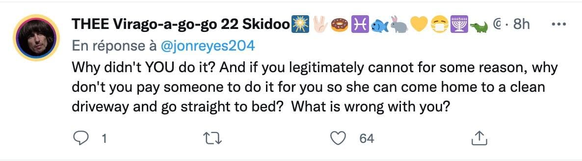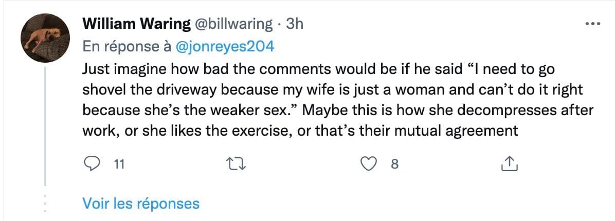«Imaginez de quoi les commentaires auraient l’air s’il avait plutôt dit “Je dois aller pelleter parce que mon épouse est une femme et elle ne peut pas le faire parce que c’est le sexe le plus faible”. Peut-être que c’est sa façon de décompresser après le travail, ou sa façon de faire de l’exercice.»