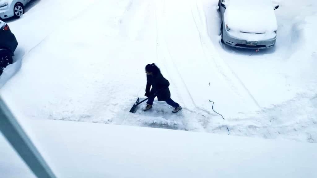 Dans la photo qui semble être prise par une fenêtre d’un deuxième étage, on peut voir la femme en train de pelleter de la neige.