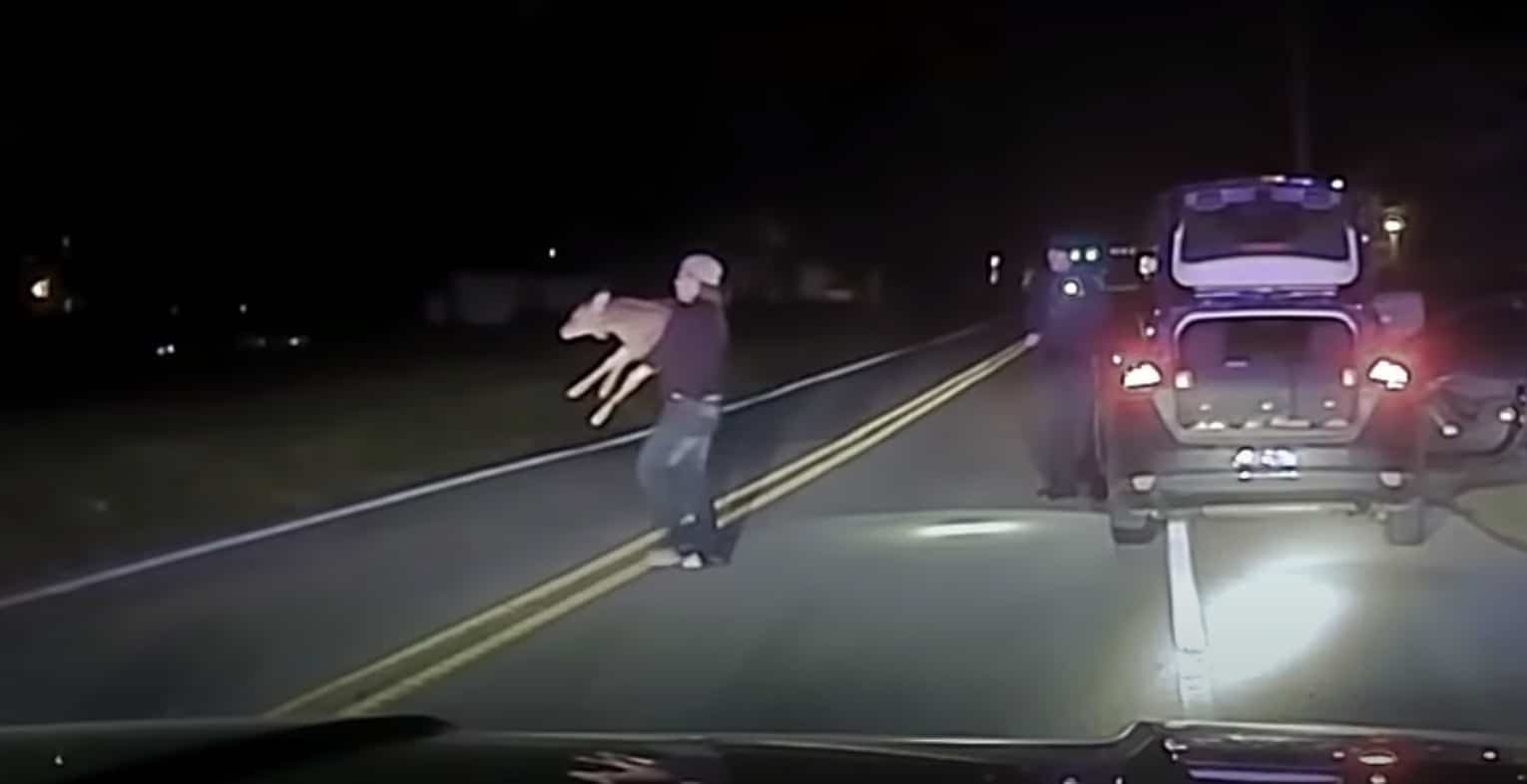 Dans une vidéo prise depuis la voiture de police, on voit les agents demander au passager de sortir pour libérer le cerf. L’homme obtempère et va ouvrir le coffre de la voiture, où il prend l’animal dans ses bras, avant de traverser la route pour le déposer de l’autre côté, tandis que le chevreuil se débat.