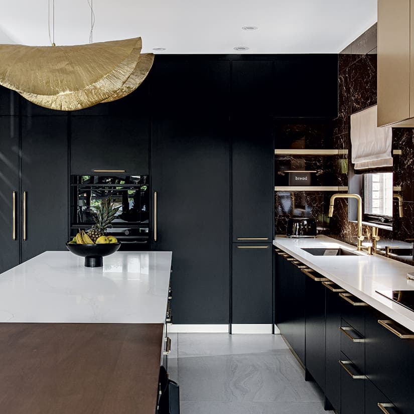 - Du dosseret en céramique à effet marbre aux comptoirs en quartz en passant par les armoires laquées, les teintes de noir, de blanc et de doré se marient avec un raffinement inouï, mais sans ostentation grâce aux surfaces lisses et aux lignes épurées.