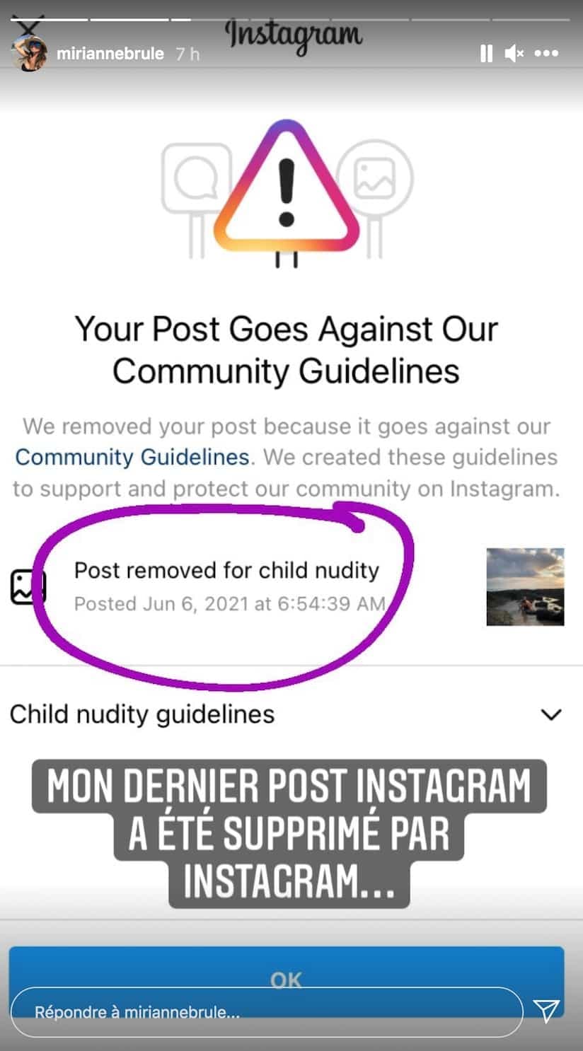 Mirianne Brûlé déplore le fait qu'Instagram ait supprimé une de ses photos avec sa fille