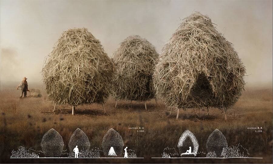 Description : Cette nouvelle installation est un abri confectionné de brindilles, qui protège les visiteurs du monde extérieur. Haïssja rappelle l'importance de revenir aux méthodes de cultures traditionnelles, particulièrement en ces temps difficiles.