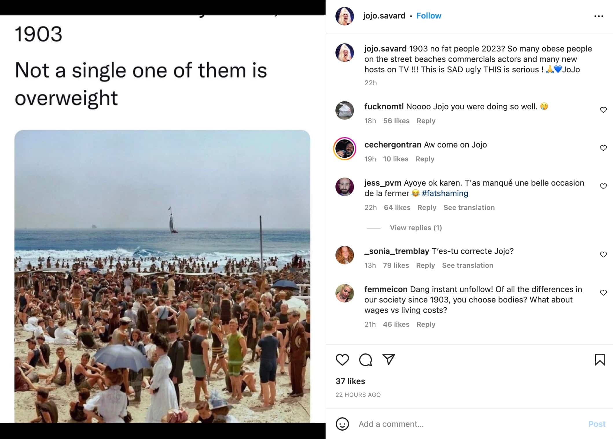 En partageant une photo d'une plage bondée datant d’autrefois, elle a écrit en légende : «1903 pas de grosses personnes 2023? Tellement de personnes obèses dans la rue, plages, publicités, acteurs et plusieurs animateurs à la télé !!! Ceci est TRISTE laid CECI est sérieux».