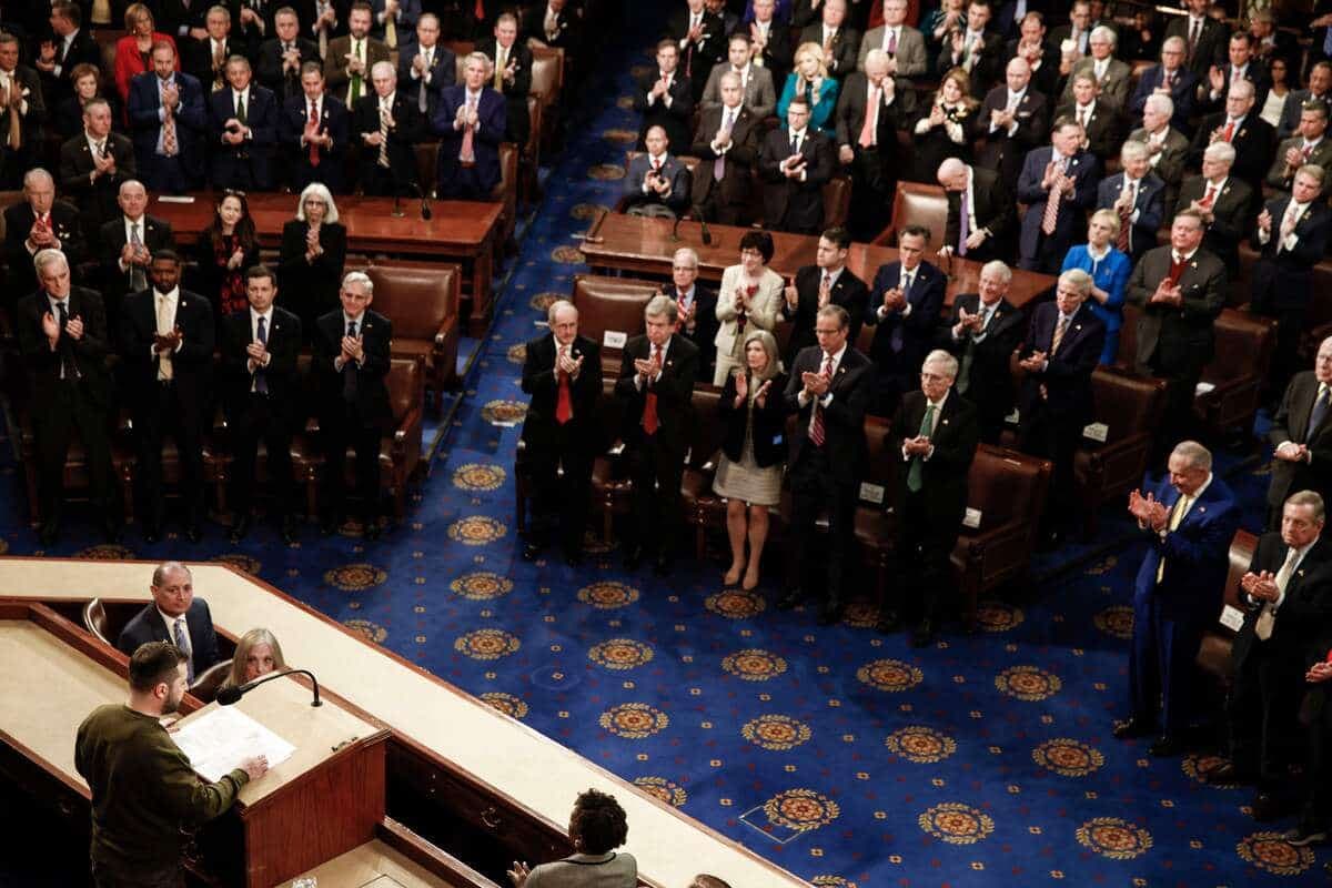 Accueilli par une ovation debout des membres de la Chambre des représentants et du Sénat, le président ukrainien, vêtu de sa traditionnelle tenue kaki, en anglais et avec la plus grande solennité, a dit: «Contrairement aux prédictions les plus funestes, l'Ukraine n'est pas tombée. L'Ukraine est vivante et combative.»